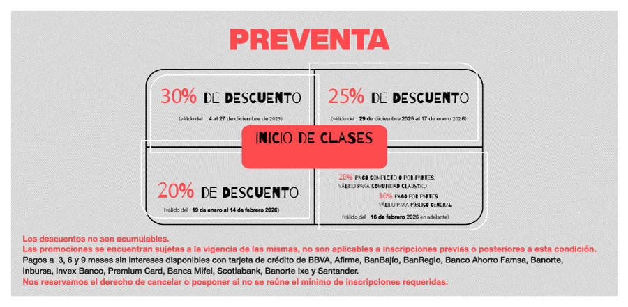 Aplica pago en una sola exhibición en inscripciones con menos de 2 semanas de antelación del inicio del programa.